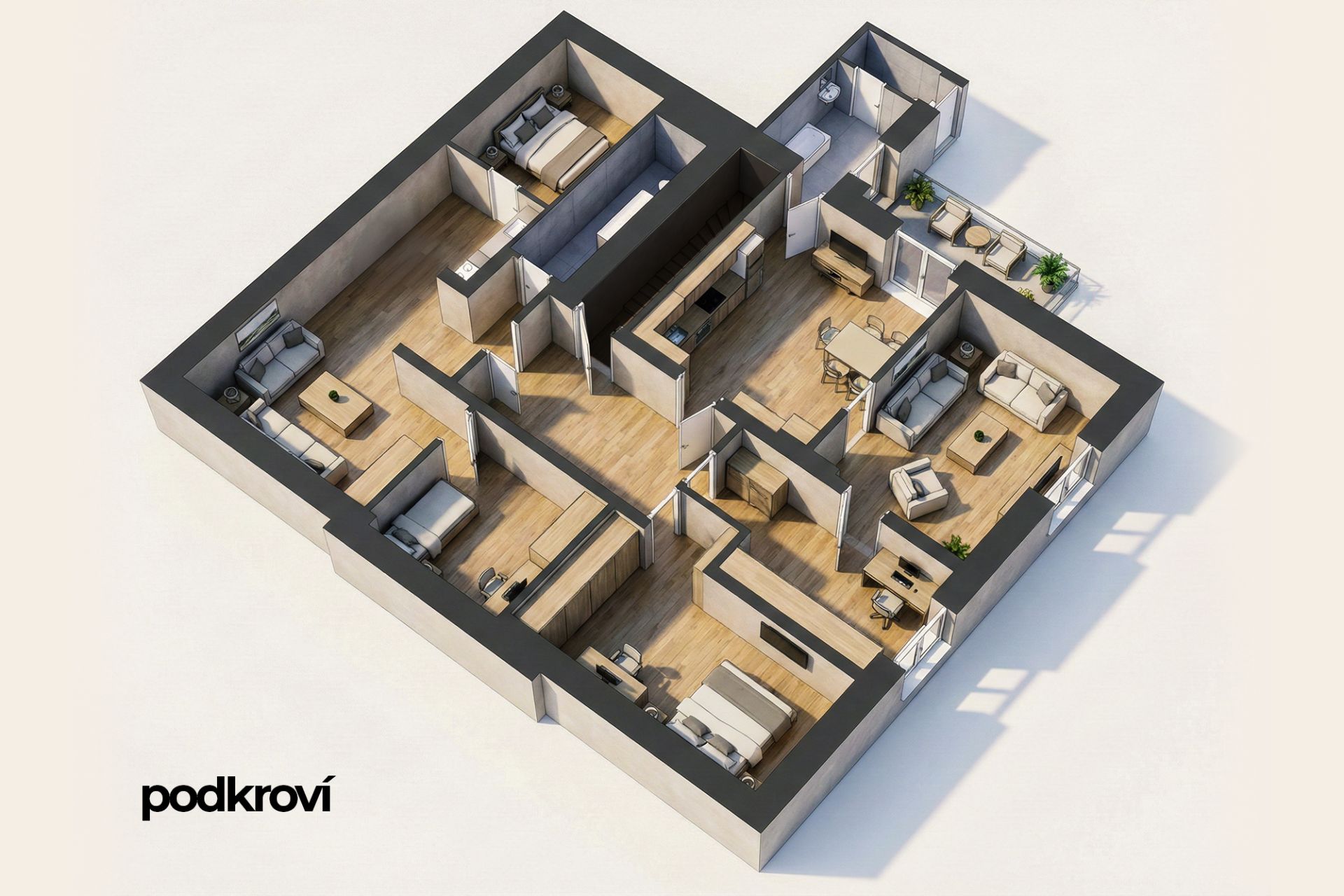 Podkroví domu nabízí další dvě bytové jednotky – byt 4+kk o ploše 75 m² a byt 2+kk o ploše 56 m², přístupné ze společné chodby. Všechny bytové jednotky jsou ve dobrém, udržovaném stavu.