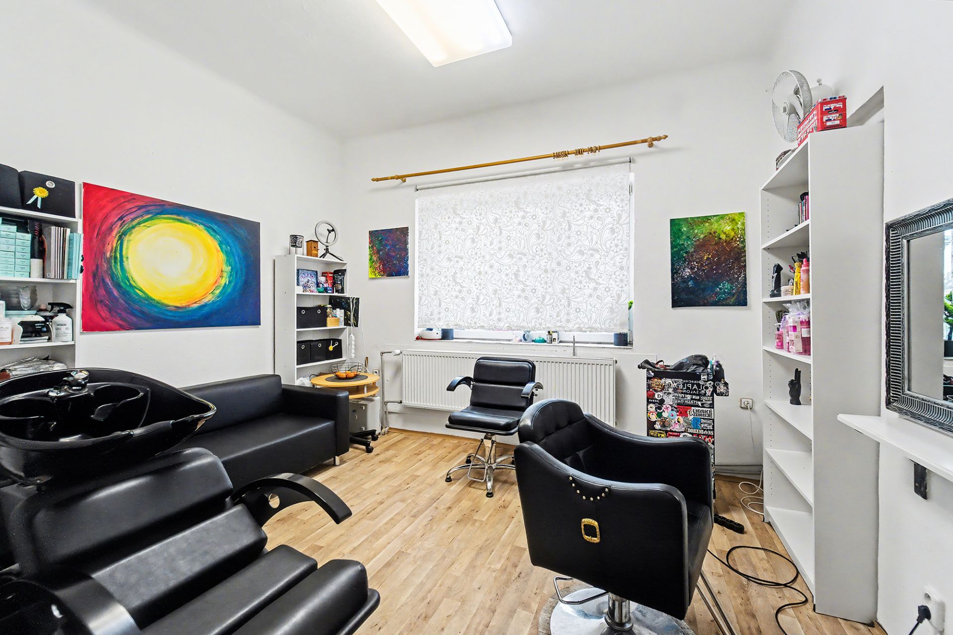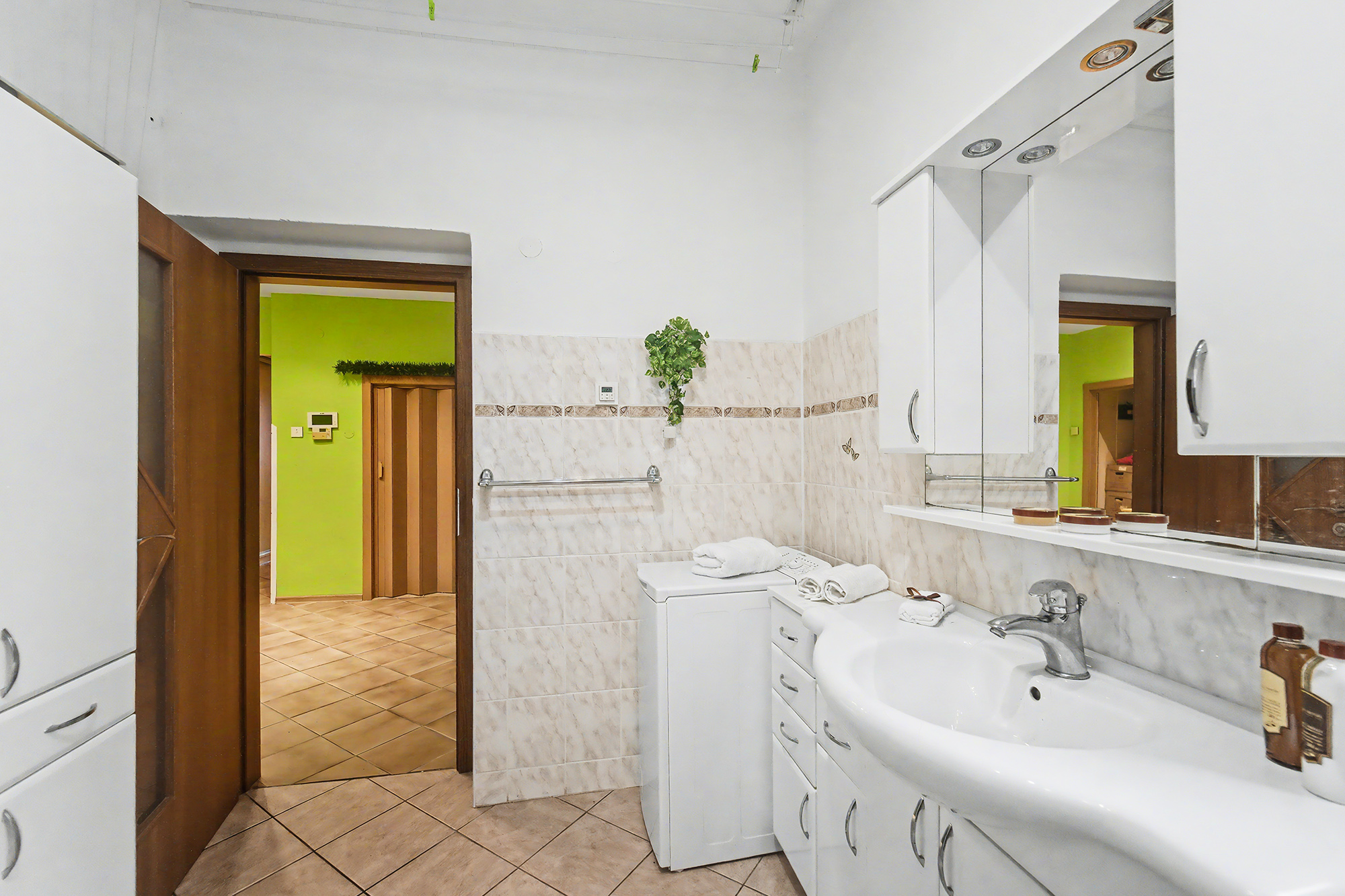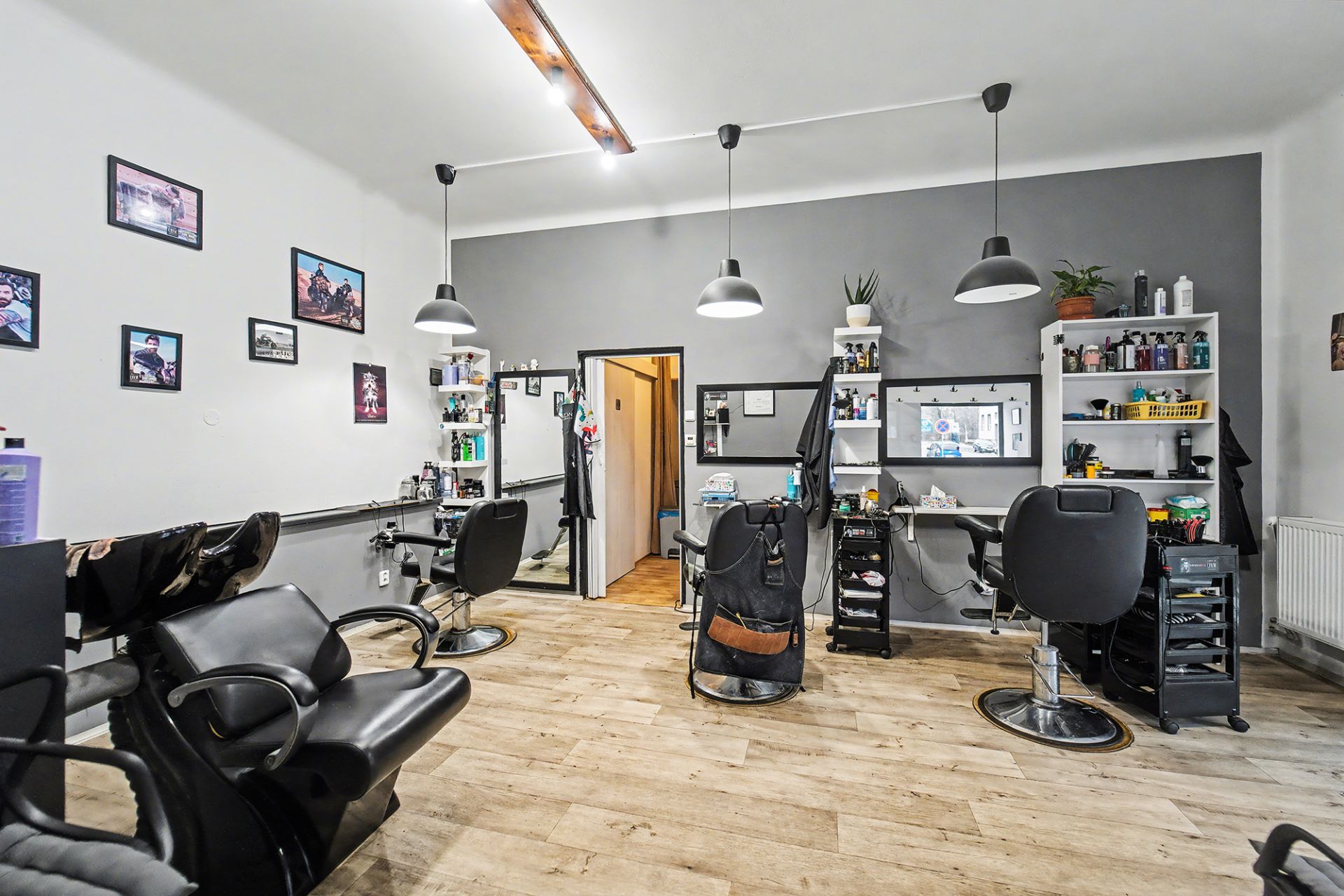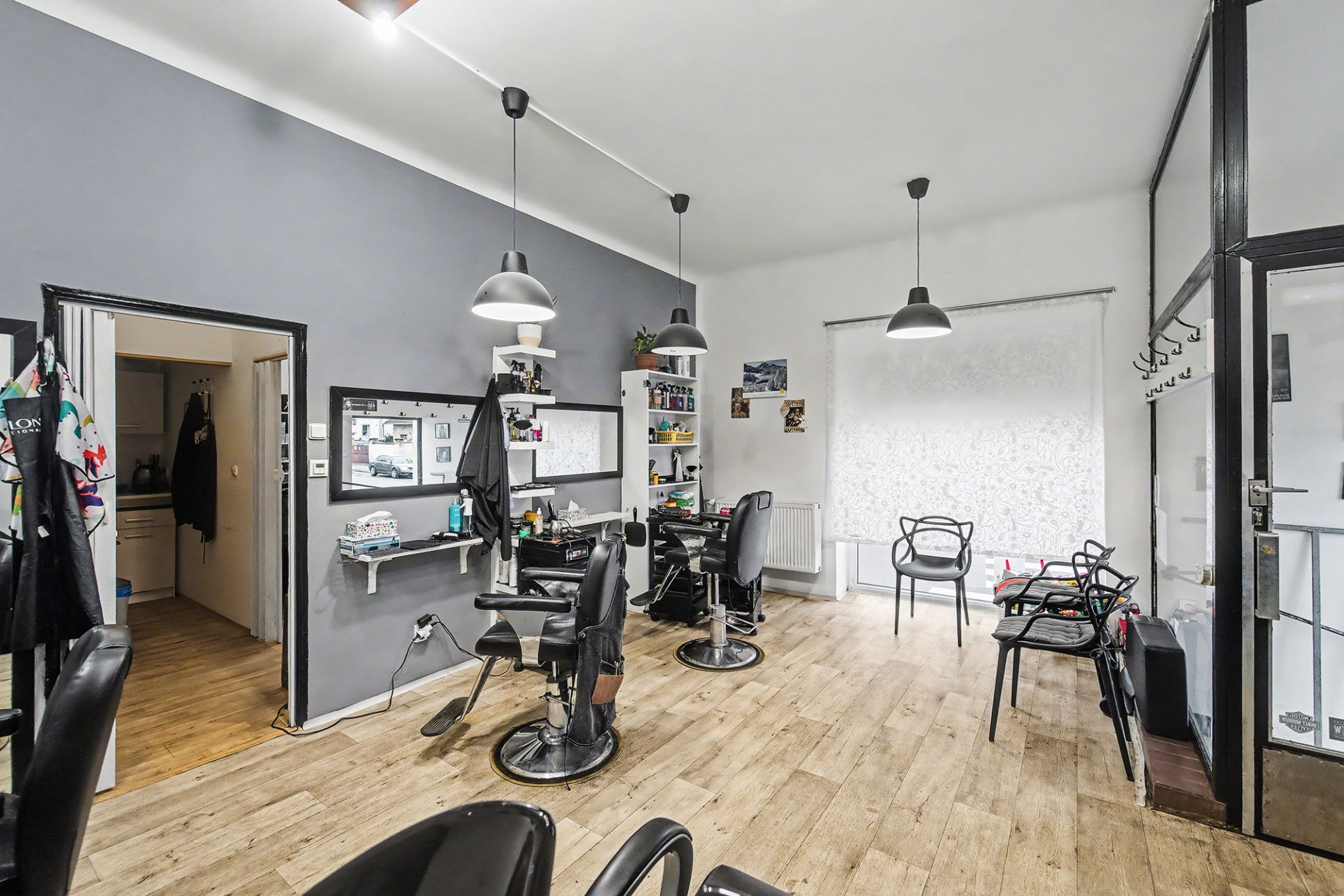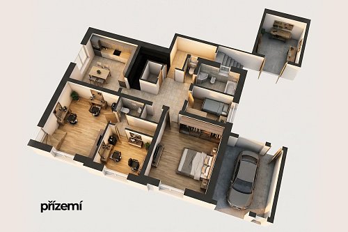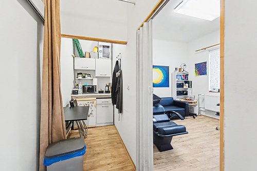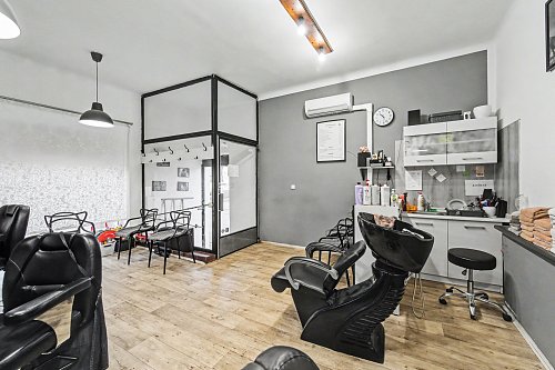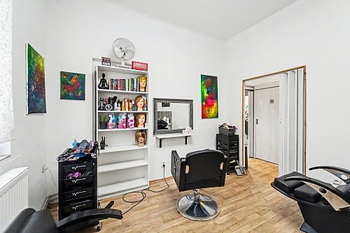 V přízemí se nachází prostorný byt 3+kk o výměře 96 m², dále společné prostory domu, dílna a garáž. Součástí přízemí je také kadeřnický salon o ploše 87 m², který má samostatný vstup z ulice a je aktuálně pronajatý, což zajišťuje okamžitý příjem.