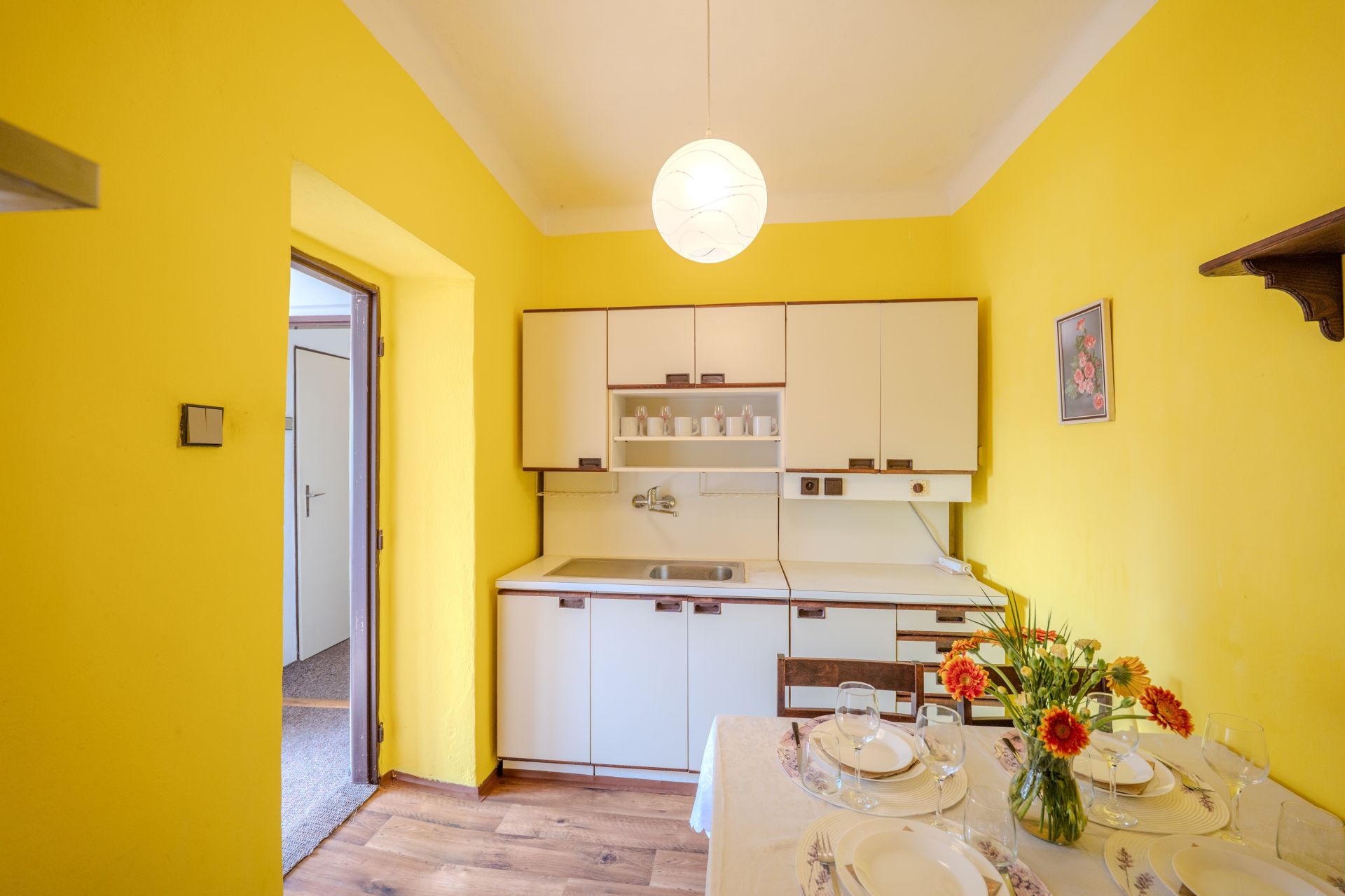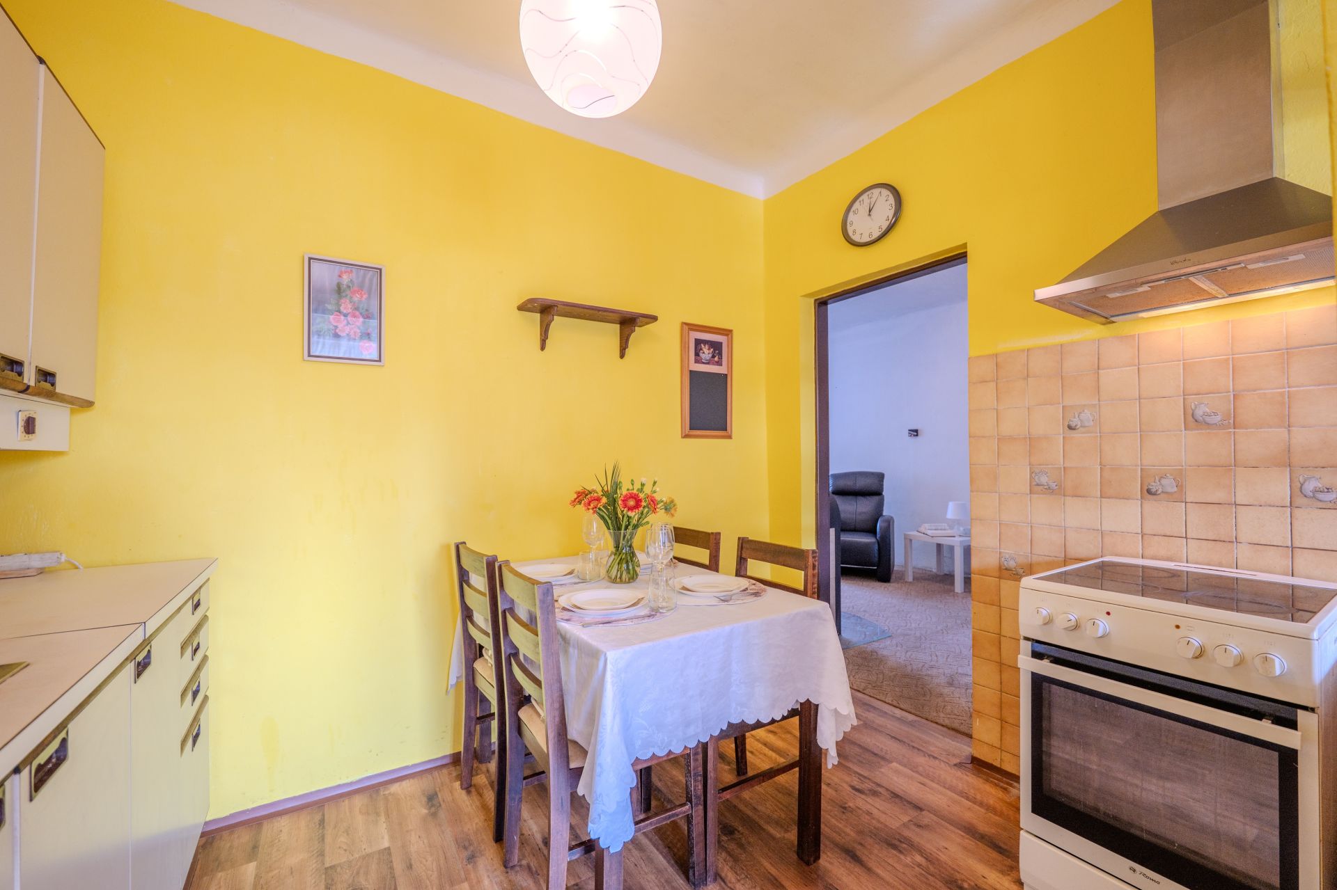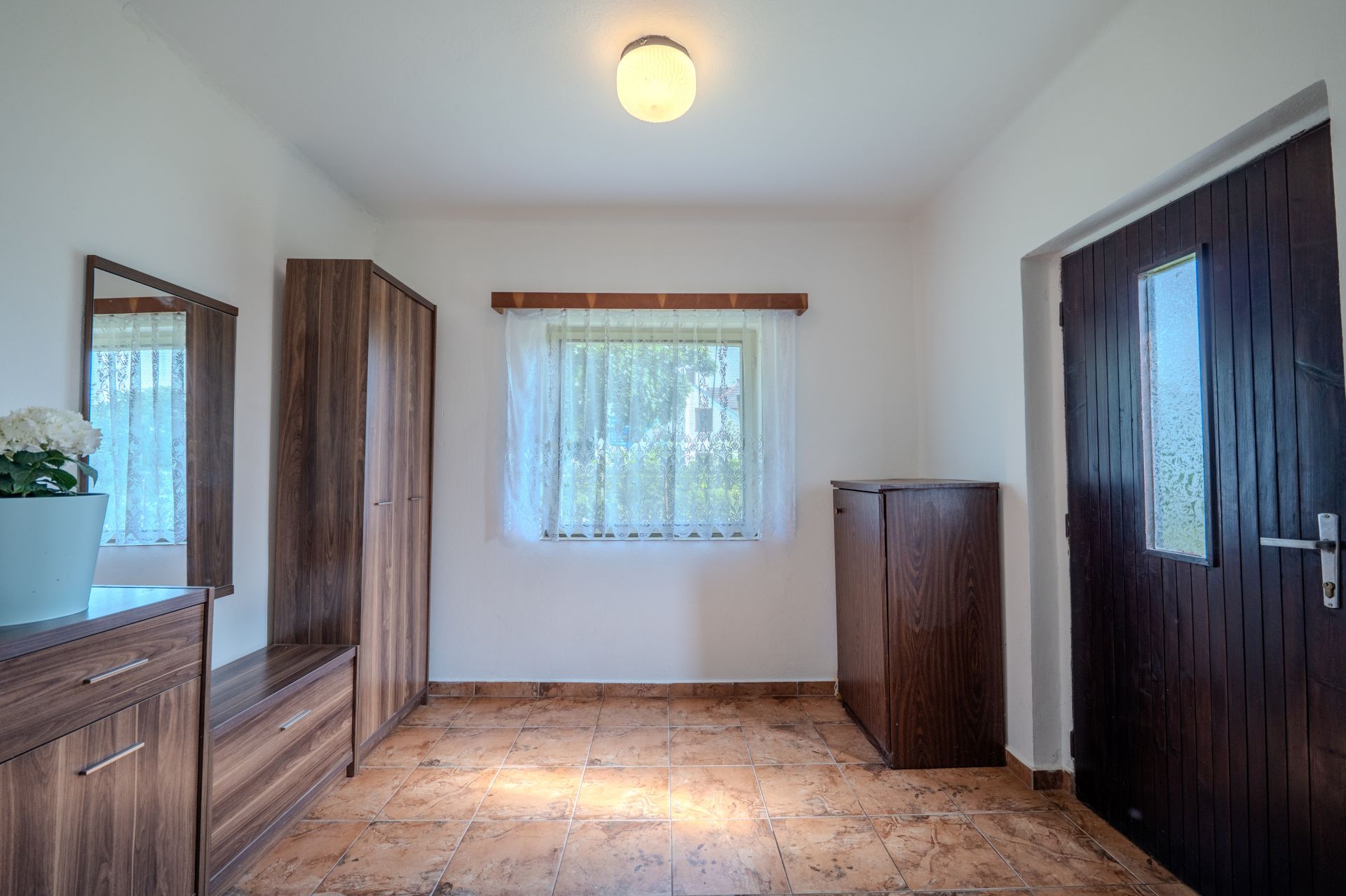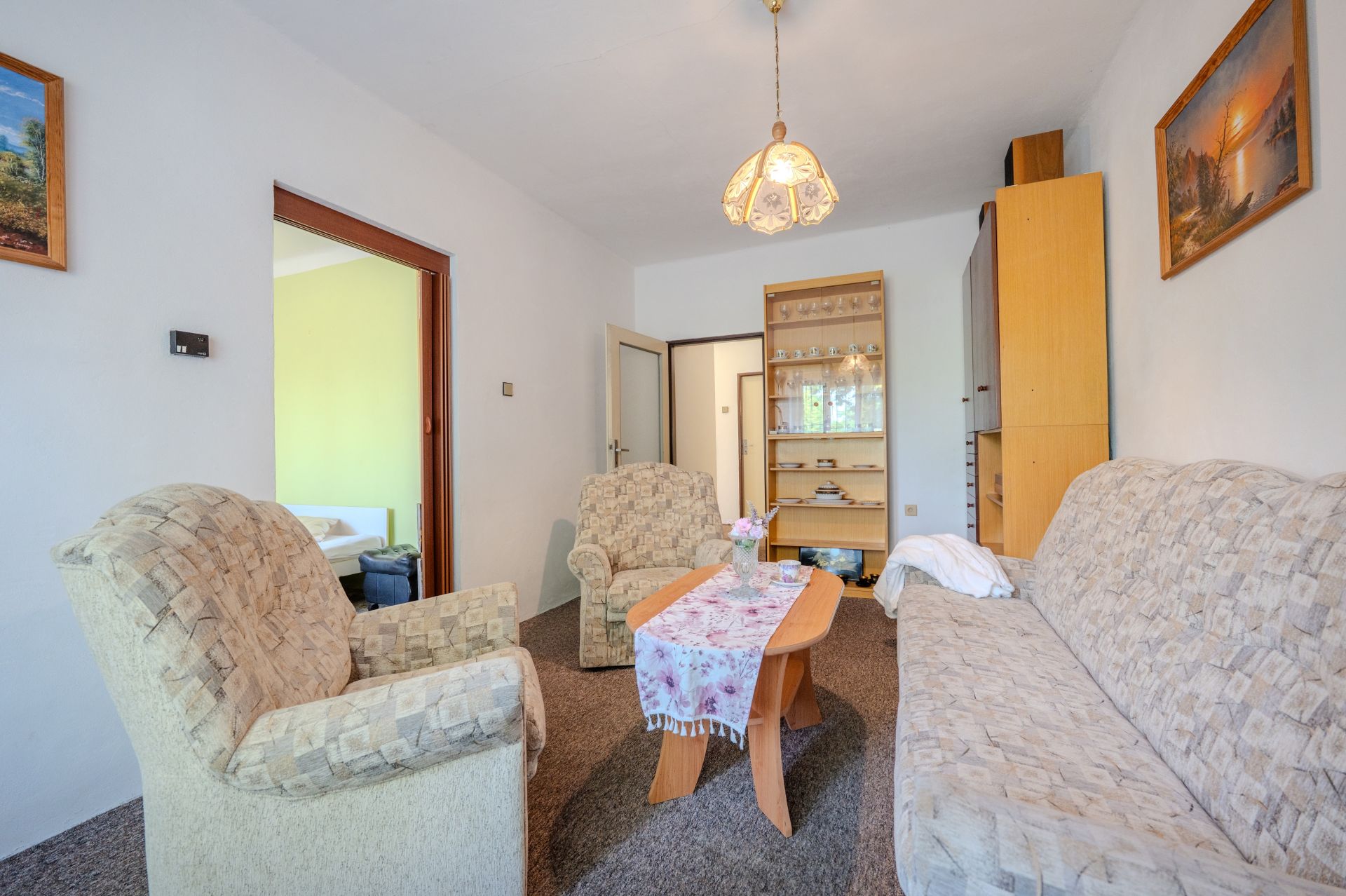 Dispozice: vstupní chodba, zádveří, kuchyně, obývací pokoj, ložnice a dětský pokoj, koupelna, spíž a